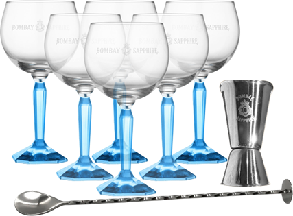 1:a pris – 6-pack Bombay Sapphire glas, Bombay Sapphire barsked och Bombay Sapphire mätglas