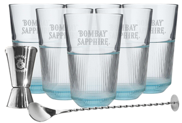 1:a pris – 6-pack Bombay Sapphire glas, Bombay Sapphire barsked och Bombay Sapphire mätglas
